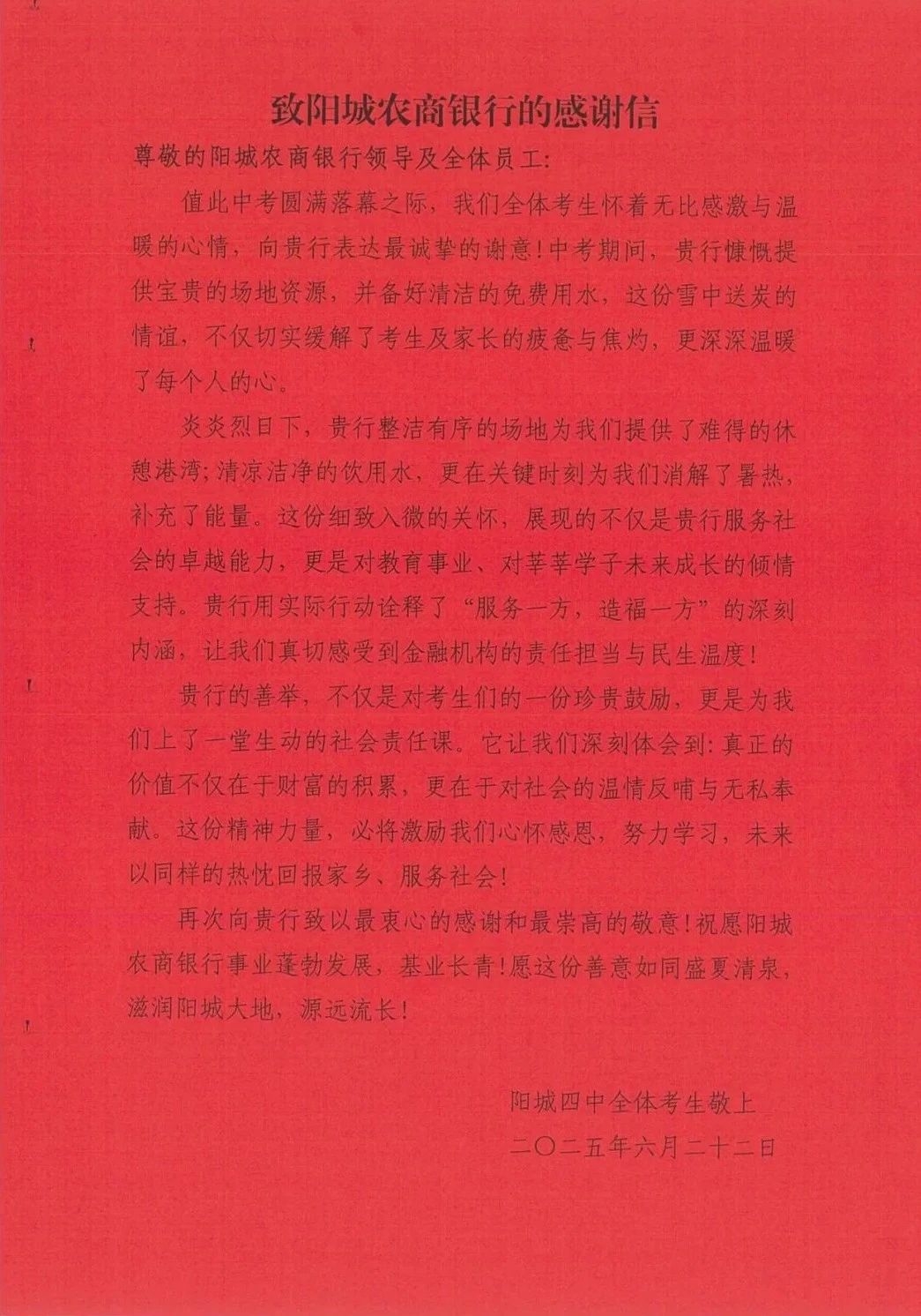 ??正如感謝信中所言:“這份善意如同盛夏清泉,滋潤著陽城大地。”而比數據更珍貴的,是那一封手寫信的溫度——它承載的不僅是謝意,更是一座城市里,農商行與老百姓之間最溫暖的羈絆。