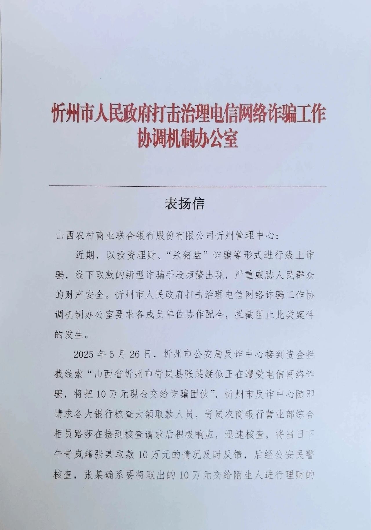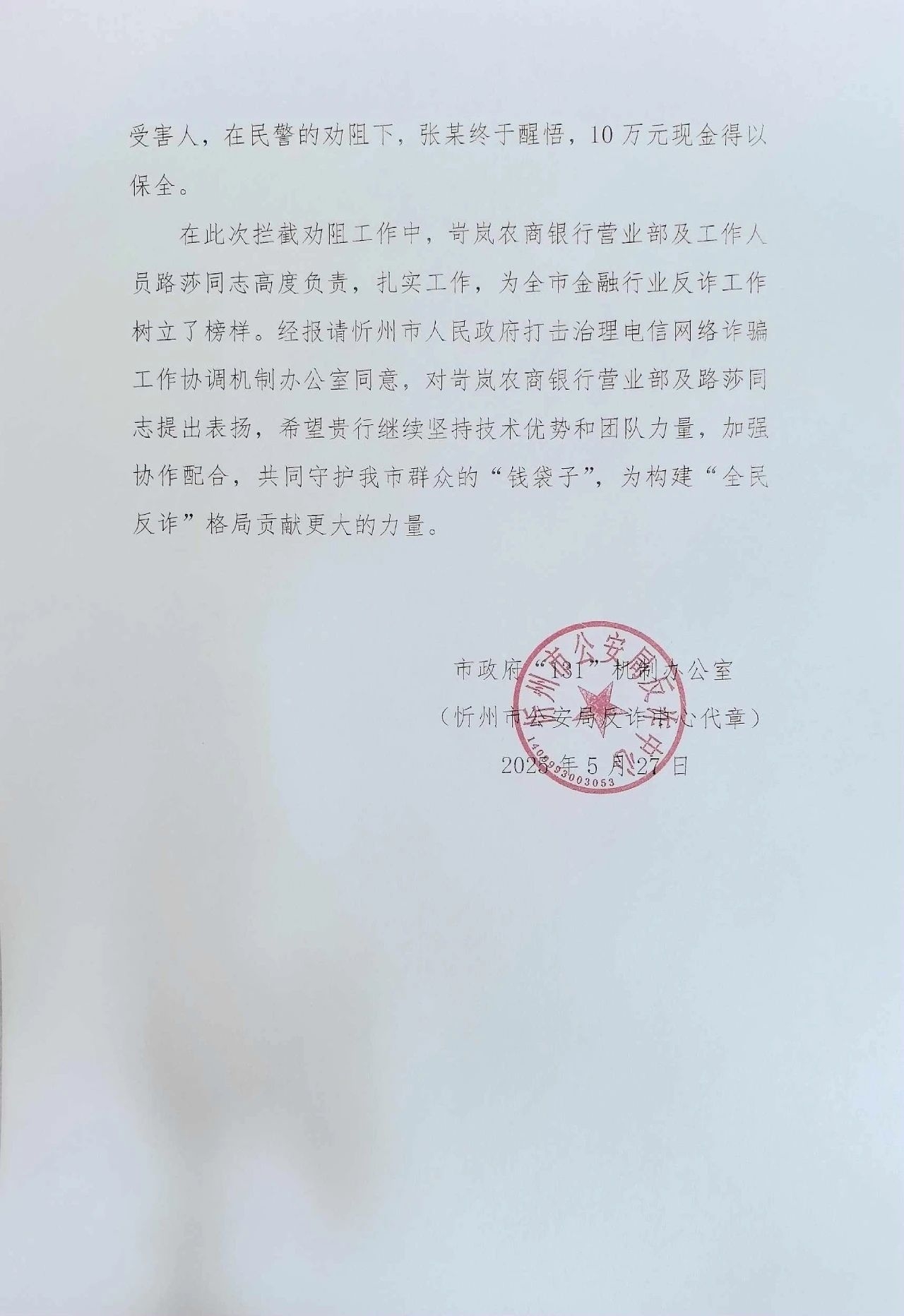 ??事后,忻州市人民政府打擊治理電信網(wǎng)絡(luò)詐騙工作協(xié)調(diào)機(jī)制辦公室專門向岢嵐農(nóng)商銀行營(yíng)業(yè)部柜員路莎送達(dá)了表?yè)P(yáng)信,對(duì)她的高度責(zé)任心和專業(yè)的防詐騙意識(shí)給予了高度評(píng)價(jià)。