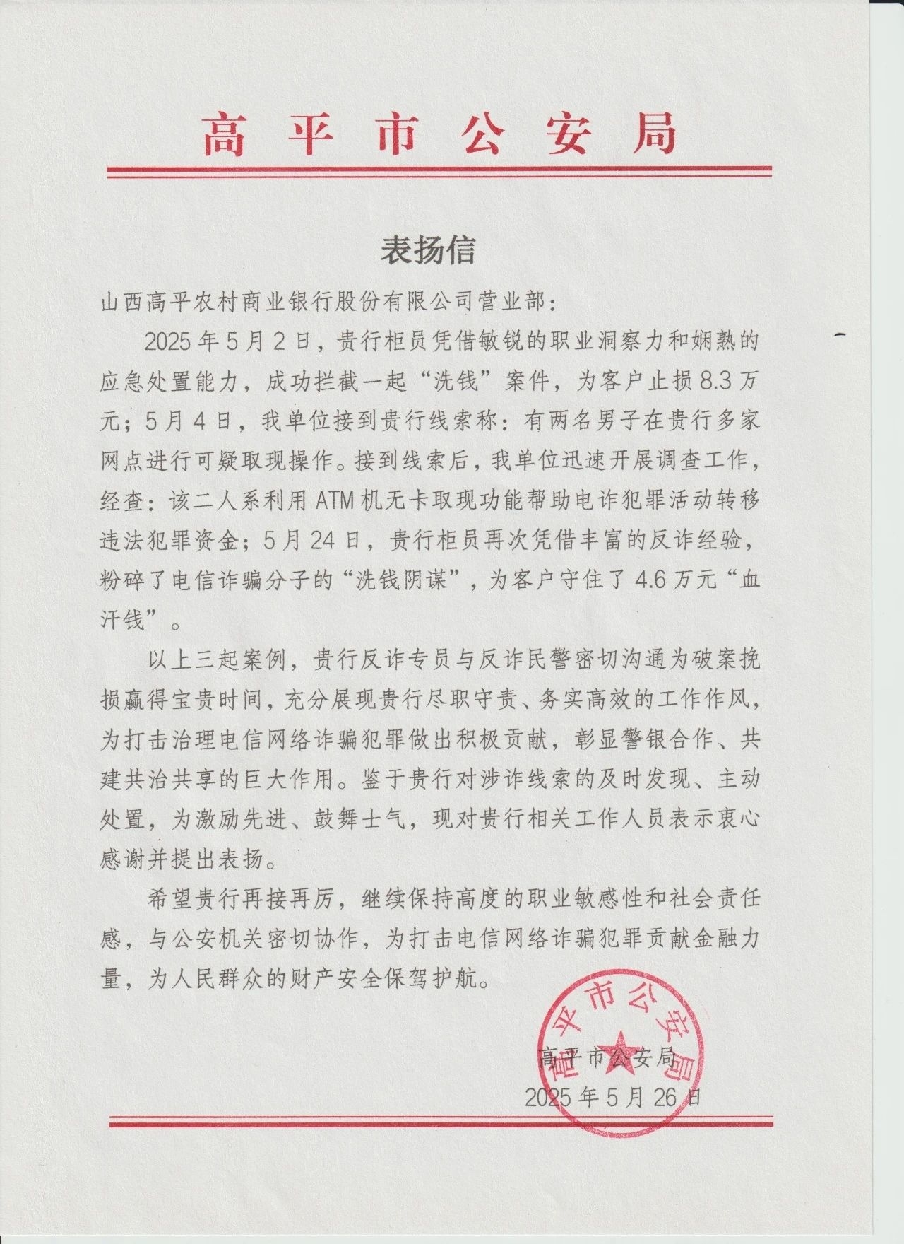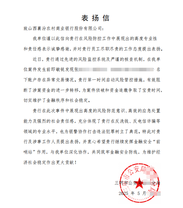 ??2025年5月13日,客戶張某前往襄汾農(nóng)商行某支行辦理取現(xiàn)業(yè)務。經(jīng)辦柜員在詢問資金來源及用途時,發(fā)現(xiàn)其言辭含糊,前后表述不一,立即提高警惕并向總行運營管理部反映情況。反詐人員通過排查,發(fā)現(xiàn)其賬戶存在多項可疑特征,隨即報警并采取緊急管控措施,成功阻斷資金轉(zhuǎn)移,受到福建省三明市公安部門表揚與感謝。在此次事件中,襄汾農(nóng)商行通過“人防+技防”雙重保障機制,實現(xiàn)了風險預警、核查攔截和后續(xù)追蹤的全流程閉環(huán)管理,彰顯了該行在防范電信詐騙領域的專業(yè)能力。