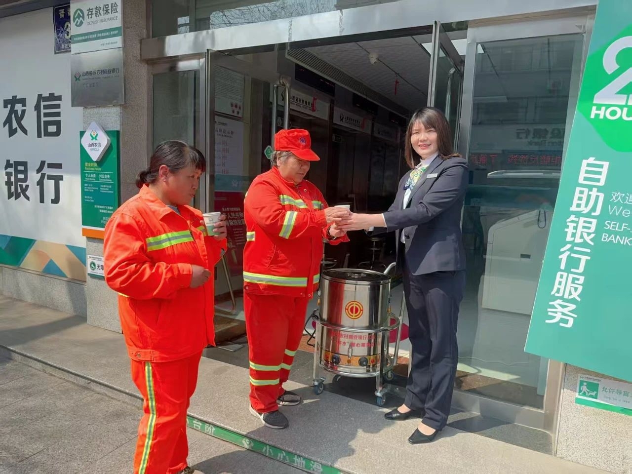 ??除日常服務外,曲沃農商銀行還開展各類特色關愛活動。臘八節時,舉辦“愛心驛站關愛‘粥’到”活動,為戶外勞動者送上熱氣騰騰的臘八粥,弘揚傳統民俗文化的同時,讓他們在寒冬感受濃濃溫情;夏日開展“夏日送清涼情系環衛工”活動,志愿者們為一線環衛工人送上藿香正氣水、扇子、礦泉水等清涼物資,叮囑他們注意防暑,用實際行動傳遞關懷。