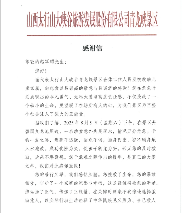 ??2025年8月12日,一封來自太行山大峽谷旅游發展股份有限公司的感謝信發到了柳林農商銀行金融市場事業部趙軍耀手中,感謝其見義勇為,英勇施救的善舉。