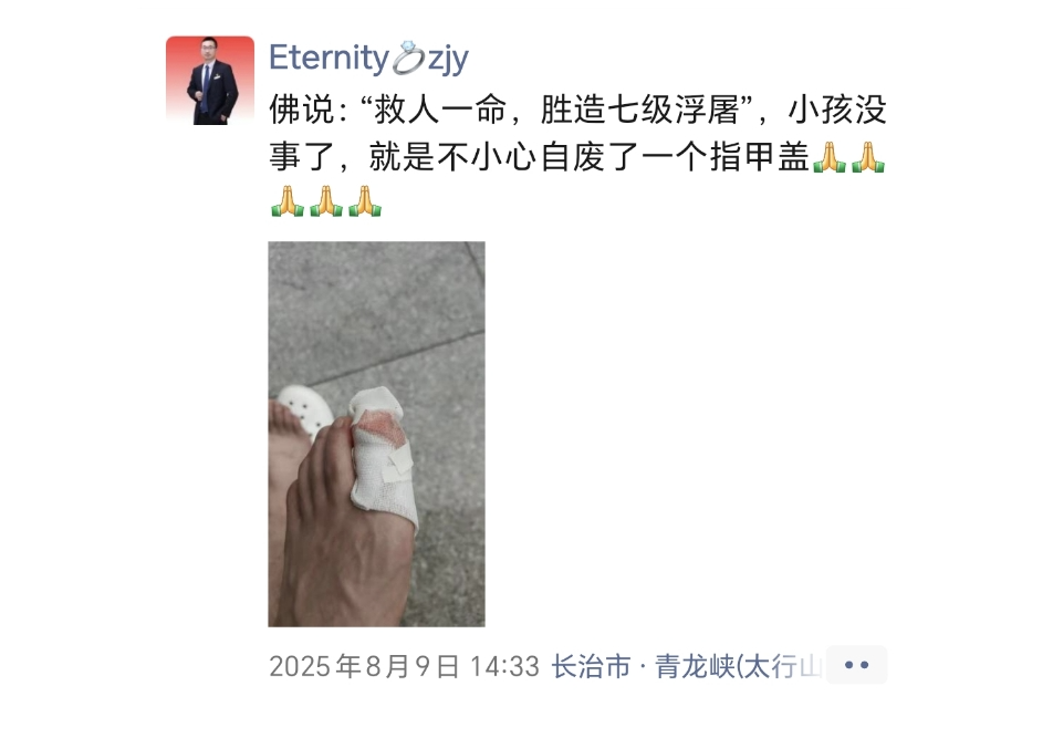 ??事發當日中午,小孩在水邊玩耍時不慎滑倒,很快就被帶入深水處,掙扎間逐漸體力不支。正在附近陪家人休假的趙軍耀聽到呼救聲后,立刻沖向水邊,來不及多想,縱身跳入水中。奮力游至對方身邊,一手托住其身體,一手奮力向岸邊劃行。快到岸邊時,趙軍耀借著水流的慣性猛地一推,岸上眾人趕緊抓住小孩的胳膊往上拉,他則順勢用胳膊肘撐住石階,幫著把人徹底送上去,自己卻因力氣耗盡,并磕掉了腳拇指甲蓋。
