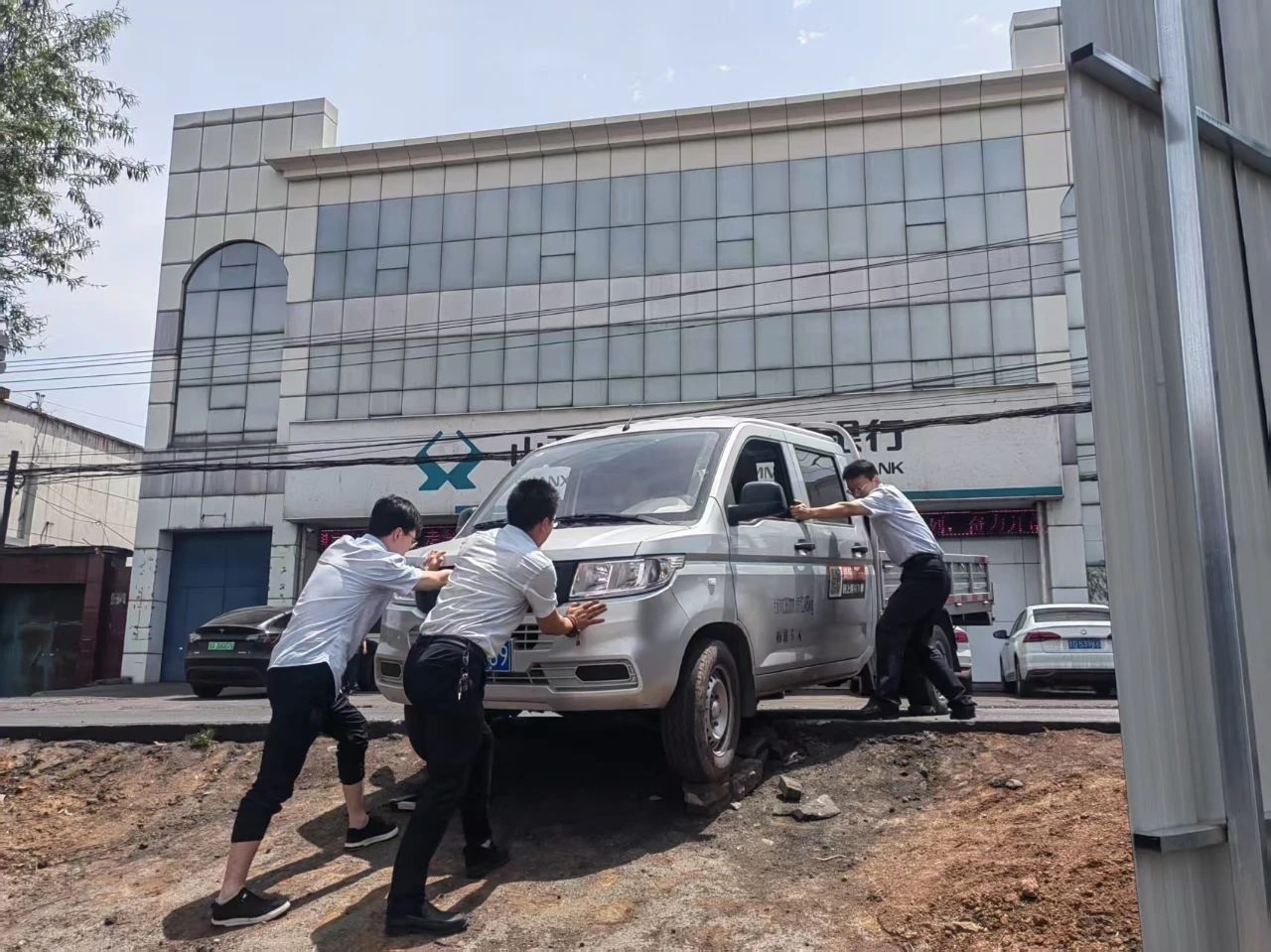 ??近日,一輛小貨車因躲避對向來車,滑入路邊斜坡,司機師傅多次嘗試,均無法自行脫困!當時,正值營業高峰期,大堂經理楊楚正在營業廳開展日常巡視,發現營業廳外路對面有一輛被困小貨車,簡單了解情況后,安排一女同事幫忙維護廳堂秩序,營業廳內保持兩人在崗維持正常營業,同時呼叫其他男同事去幫忙。全員沒有絲毫猶豫,立刻放下手頭工作加入救援。他們分工協作,有人找來磚頭墊在車輪下,有人指揮交通確保安全,其余員工則合力推車。由于天氣太熱,推車期間,大家的身上都被弄得滿是灰塵,臉上是汗水粘著灰塵,大家都只是簡單擦拭后便繼續投入救援中。經過二十余分鐘的努力,伴隨著整齊的號子聲,大家終于幫助車輛成功脫困。