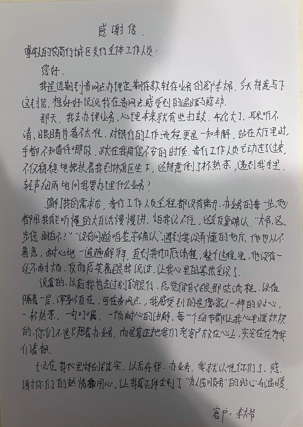 ??幾天后,網(wǎng)點工作人員驚喜地收到了李大爺送來的感謝信。信中,李大爺寫道:“你們的熱情服務(wù)讓我這個老頭子心里暖烘烘的,真正體會到了什么是為百姓服務(wù)。每一個細節(jié)都讓我感受到你們的用心,我以后存錢辦事就認準你們農(nóng)商行了”。