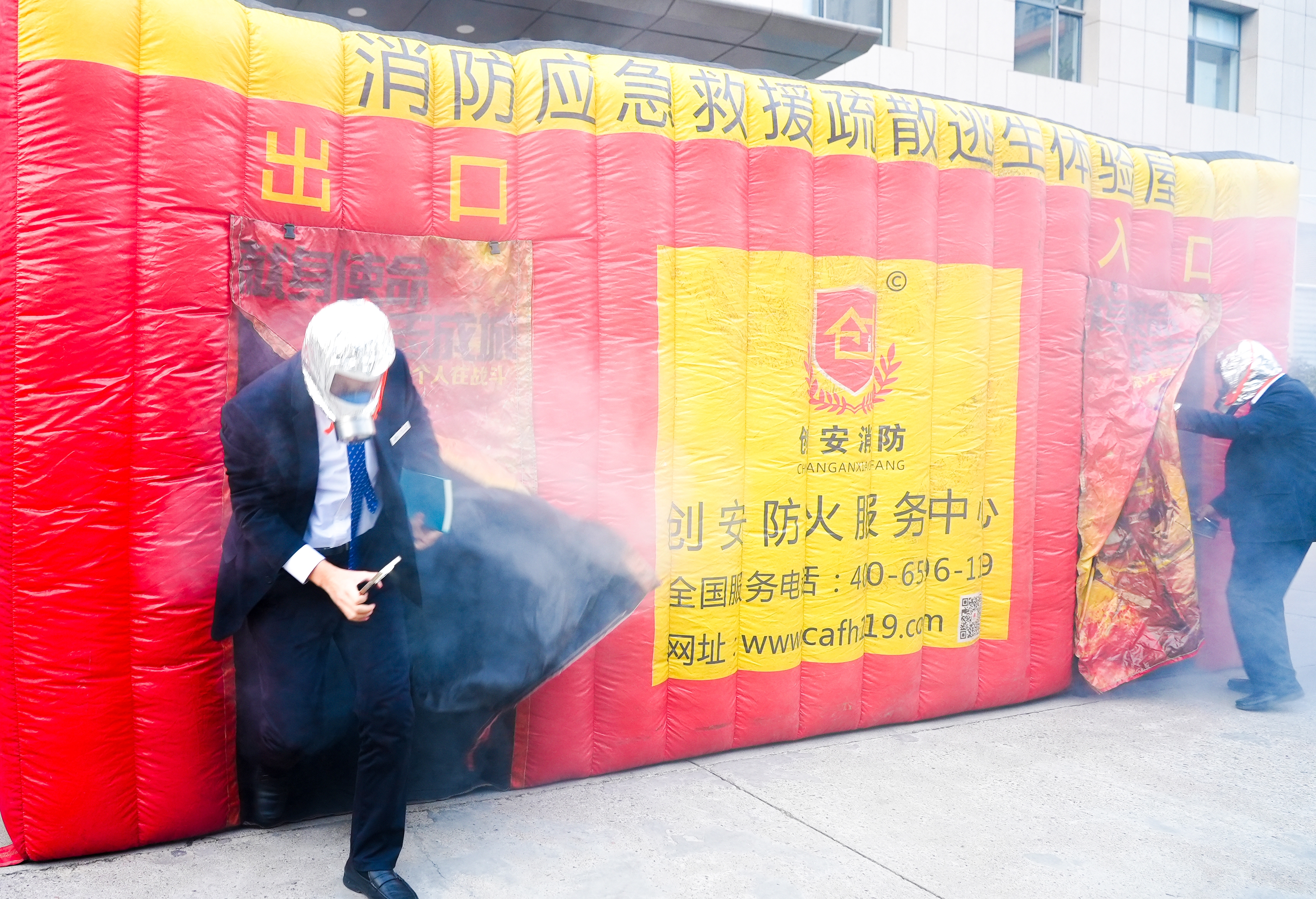 隨后,演練環(huán)節(jié)在總行后院設(shè)置的消防應(yīng)急救援疏散逃生體驗屋中展開。隨著模擬火災(zāi)警報響起,演練正式啟動。全體參訓(xùn)人員在教官的統(tǒng)一指揮下,迅速佩戴好防煙面罩,彎腰低姿,按照預(yù)定疏散路線,有序進入充滿模擬濃煙的黑暗逃生屋。面對能見度低、煙霧彌漫的仿真環(huán)境,大家沉著冷靜,互相提醒,有效避開障礙物,并在消防教官的實時引導(dǎo)下,快速、安全地從出口撤離至指定集合點。整個疏散過程組織嚴密、反應(yīng)迅速、配合默契,未發(fā)生擁擠、踩踏等意外情況,僅用時3分鐘即完成全員疏散。