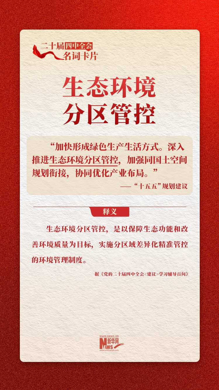 ??強化生態環境分區管控領域相關基礎理論、學科建設、科學研究、技術應用和人才培養,加快建立專業化隊伍。對生態功能明顯降低的生態環境優先保護單元、生態環境問題突出的生態環境重點管控單元、環境質量明顯下降的其他區域,加強監管執法,依法依規推動限期整改。生態環境分區管控制度實施中存在的突出問題,納入中央和省級生態環境保護督察,分區管控實施情況納入污染防治攻堅戰成效考核。(據《黨的二十屆四中全會〈建議〉學習輔導百問》)