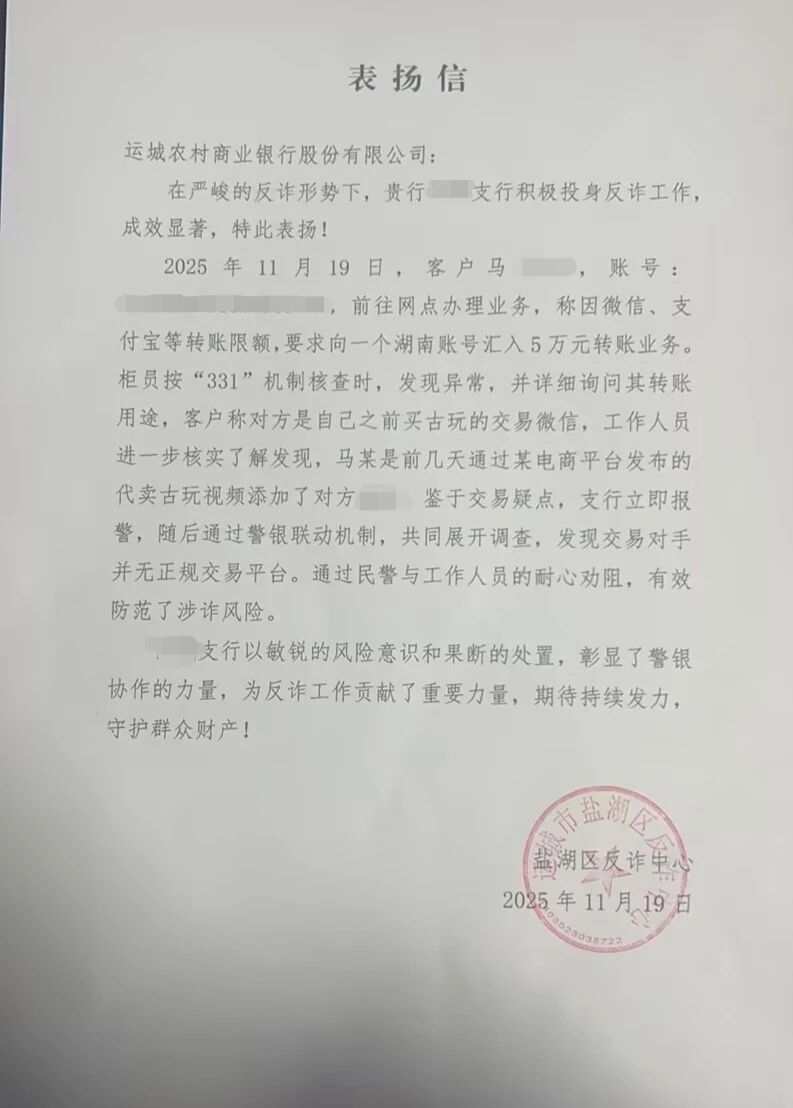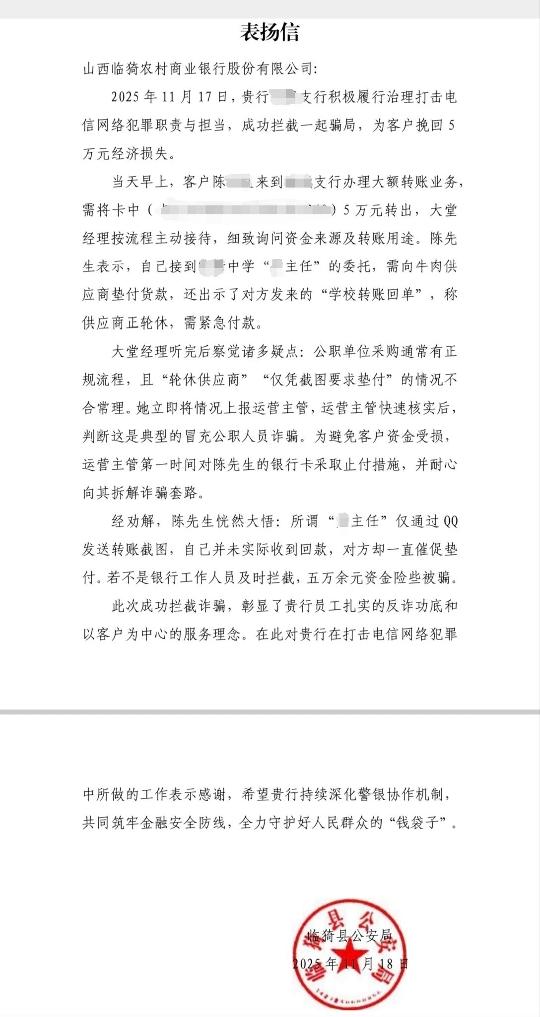 ??11月17日,客戶陳先生來到臨猗農商行某支行辦理5萬元大額轉賬業務,工作人員溫馨提示警惕電詐并詢問資金用途。陳先生表示,自己接到一中學“主任”的委托,需向牛肉供應商墊付貨款,還出示了對方發來的“轉賬憑證”。工作人員聽完后察覺諸多疑點:公職單位采購通常有正規流程,且僅憑手機圖片要求墊付款項的情況不合常理,初步判斷這是一起典型的冒充公職人員詐騙事件。為避免客戶資金受損,該支行第一時間對陳先生的銀行卡采取止付措施,并耐心向其拆解詐騙套路。